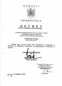 - Systems, Indaco. „Decretul nr. 40/2012 privind acreditarea unui ambasador” (în Romanian). Lege5. Accesat în .