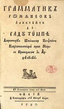 ![]() Pagina de titlu a lucrării „Gramatica românească”, Sibiu, 1797, de Radu Tempea | |