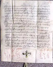 Hrisovul voievodului Radu cel Frumos dat in Cetatea de Scaun a Bucureștilor, 14 octombrie 1465, pergament (facsimil). Documentul este prima atestare a Bucureștiului.