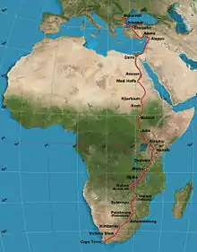 Traseul planificat al raidului era București – Istanbul – Eskișehir – Konya – Adana – Alep – Gaza – Cairo – Assiut – Assuan – Wadi Halfa – Atbara – Khartum – Kosti – Malakal – Juba – Kisumu – Nairobi – Moshi – Dodoma – Mbeya – Mpika – Broken Hill – Salisbury – Bulawayo – Pietersburg – Johannesburg – Kimberley – Victoria West – Cape Town și retur.[17][23] Unele dintre acestea erau puncte vamale obligatorii.[24]