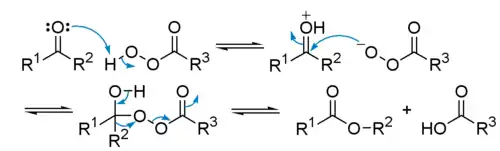 Într-o primă etapă a mecanismul de reacție, peroxiacidul protonează atomul de oxigen din grupa funcțională carbonil.[1] În urma protonării, grupa devine mai susceptibilă la atacul peroxiacidului. În continuare, peroxiacidul atacă carbonul grupei carbonilice, formând un intermediar de tip Criegee. Etapa prezintă un mecanism concertat, iar unul dintre substituenții cetonei migrează la atomul de oxigen al grupei peroxid, în timp de se elimină un acid carboxilic (aceasta este probabil etapa determinantă de viteză).[1][2] În etapa finală, deprotonarea ionului oxo-carbeniu duce la obținere esterului corespunzător.[1]
