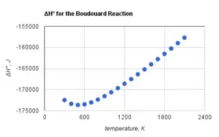 Reacția Boudouard formează dioxid de carbon și carbon și este exotermă la orice temperatură. Cu toate acestea, entalpia standard a reacției Boudouard devine mai puțin negativă odată cu creșterea temperaturii,[2] după cum se observă în imagine.