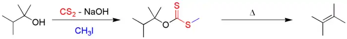 La aproximativ 200 °C, are loc formarea alchenei în urma unui proces de eliminare intramoleculară. Prin intermediul unei stări de tranziție hexaciclice, atomul de hidrogen este eliminat de la atomul de carbon β și se leagă de atomul de oxigen din xantogenat (sin-eliminare). Produsul secundar se descompune la sulfură de carbonil (OCS) și metantiol:
