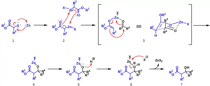 Pentru formarea agentului organozincic, are loc o inserție a zincului metalic în legătura carbon-halogen a α-haloesterului prin adiție oxidativă (1). Acest compus dimerizează și suferă o transpoziție formând doi enolați de zinc (2). Atomul de oxigen carbonilic din aldehidă sau din cetonă va coordina zincul, formând o stare de tranziție (3). Acesta suferă o transpoziție, iar zincul se mută la oxigenul carbonilic, iar concomitent are loc formarea unei legături carbon-carbon (4). Prin intervenția unui acid (5,6) se elimină săruri de zinc și β-hidroxi-esterii corespunzători (7).[5]