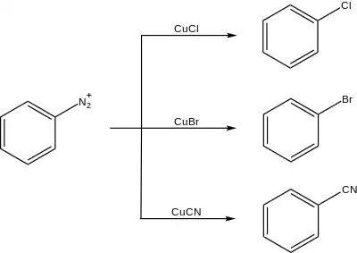 Diferite variante ale reacției Sandmeyer au fost dezvoltate cu scopul de a se putea sintetiza diverși compuși. De obicei, aceste reacții au loc prin intermediul unor săruri de aril-diazoniu, iar acestea reacționează cu săruri de cupru (I), dând arene convenabil substituite (se pot obține pe această cale: clorobenzen, bromobenzen, benzonitril, etc.)[9]