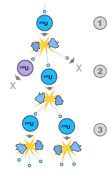 2. O parte din acești neutroni este absorbită de un atom de uraniu-238 și nu mai participă, în continuare, la reacție. O alta fracțiune din neutronii rezultați este pur și simplu pierdută în mediul/materialul înconjurător, nemaiciocndu-se cu alți atomi de uraniu, fapt pentru care nu mai participă la continuarea reacției. În final, o ultimă fracție din neutronii se ciocnește cu atomi de uraniu-235, care fisionează la rândul lor.