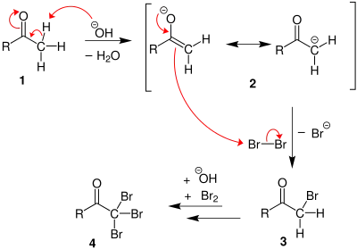 1. În mediul bazic, cetona suferă tautomerie ceto-enolică. Ionul enolat va ataca nucleofil o moleculă de brom.