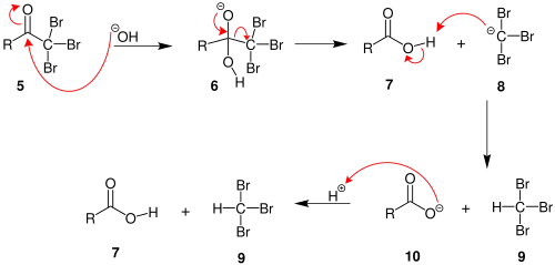 2. În momentul în care poziția alfa a fost complet substituită cu halogen (halogenare exhaustivă), va avea loc un atac nucleofil al hidroxidului, −CX3 eliminându-se și stabilizându-se ulterior (datorită grupelor atrăgătoare de electroni).