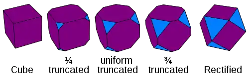 Rectificarea este punctul final al unui proces de trunchiere. De exemplu, pe un cub această secvență arată patru pași ai unui continuum de trunchieri între forma regulată și cea rectificată: