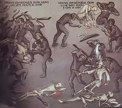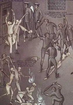 „Deținuții indicați în aceste liste au fost adunați și scoși în curtea penitenciarului, unde Dl. Lazăr Tiberiu i-a aranjat în cerc, prin flanc[,] câte unul, dându-le ordin să meargă în pas alergător, dânsul aflându-se în mijlocul cercului. Apoi, a dat ordin Dlui milițian Fulop Martin să-i aducă două ciomege, cu care se cărau ciuberele cu mâncare și a început să-i bată pe deținuți, care alergau în cerc, cu aceste ciomege, lovindu-i unde nimerea: peste spate, peste picioare, peste cap etc. Deținuții care cădeau jos erau bătuți cu picioarele și obligați să se ridice și să continue să alerge. / Când Dl. Lazăr Tiberiu scăpa ciomagul din mână, Dl. Fulop Martin i-l dădea pe celălalt, pregătit în acest scop.”—Alexandru Popa - Proces-Verbal de Interogatoriu, 25/08/1953, în Memorialul ororii, pp.210-211[84]