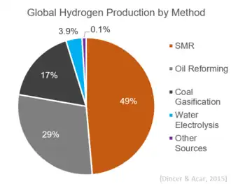 Reformarea cu abur a gazului natural produce cea mai mare parte a hidrogenului din lume. Hidrogenul produs prin reformarea cu abur este denumit „hidrogen gri” când dioxidul de carbon rezultat este eliberat în atmosferă și „hidrogen albastru” când dioxidul de carbon este (în mare parte) captat și stocat geologic.