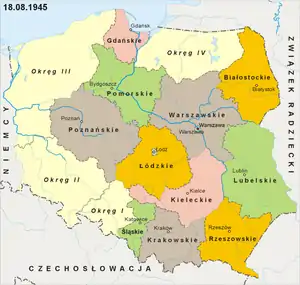 - la 18 august 1945 — voievodatul Liov a fost lichidat și înlocuit cu voievodatul Rzeszów. Câteva powiate au fost mutate de la unele voievodate la celelalte. Orașul Łódź a primit drepturi de voievodatul separat.