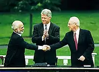 Bill Clinton, Ițhak Rabin și regele Hussein la semnarea tratatului de pace israeliano-iordanian