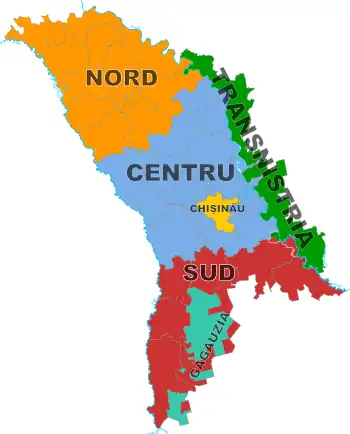 - Regiunea de dezvoltare Centru (reședința: Ialoveni) - raioanele Anenii Noi, Călărași, Criuleni, Dubăsari, Hîncești, Ialoveni, Nisporeni, Orhei, Rezina, Strășeni, Șoldănești, Telenești, Ungheni.