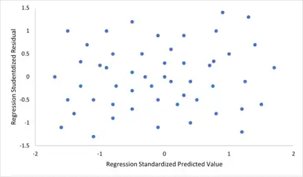 - Varianță constantă. Aceasta înseamnă că varianța erorilor nu depinde de valorile variabilelor predictoare. Astfel, variabilitatea răspunsurilor pentru valori fixe date ale predictorilor este aceeași, indiferent de cât de mari sau mici sunt răspunsurile. Acesta nu este adesea cazul, deoarece o variabilă a cărei medie este mare va avea de obicei o varianță mai mare decât una a cărei medie este mică. De exemplu, o persoană al cărei venit anual este estimat a fi de 100.000 de lei poate avea cu ușurință un venit real de 80.000 de lei sau 120.000 de lei — adică o abatere standard de aproximativ 20.000 de lei — în timp ce o altă persoană cu un venit anual estimat de 10.000 de lei este puțin probabil să aibă aceeași abatere standard de 20.000 de lei, deoarece aceasta ar presupune că venitul lor real ar putea varia între −10.000 de lei și 30.000 de lei. (De fapt, după cum arată acest lucru, în multe cazuri — de multe ori aceleași cazuri în care ipoteza erorilor distribuite normal eșuează — varianța sau abaterea standard ar trebui prezisă a fi proporțională cu media, decât drept constantă.) Pentru a verifica această ipoteză, o diagramă de reziduuri în raport cu valorile prezise (sau valorile individuale ale fiecărei predictoare) poate fi examinată pentru un „efect de ventilare” (adică, creșterea sau scăderea distribuției verticale pe măsură ce se deplasează de la stânga la dreapta pe diagramă) . Un grafic al reziduurilor absolute sau pătrate în raport cu valorile prezise (sau cu fiecare predictoare) poate fi, de asemenea, examinat pentru o tendință sau o curbură. În unele cazuri, este posibil să se rezolve problema prin aplicarea unei transformări variabilei de răspuns (de exemplu, potrivirea logaritmului variabilei de răspuns folosind un model de regresie liniară, ceea ce implică faptul că variabila de răspuns în sine are o distribuție log-normală în loc de o distribuție normală).