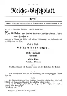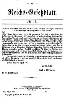 Prima ediție a Reichsgesetzblatt a apărut pe 8 mai 1871 ca nr. 19 de la pagina 95 a colecției anului 1871,[2] , deoarece Bundesgesetzblatt des Deutschen Bundes a continuat să apară în același volum sub numele de „Reichsgesetzblatt”.