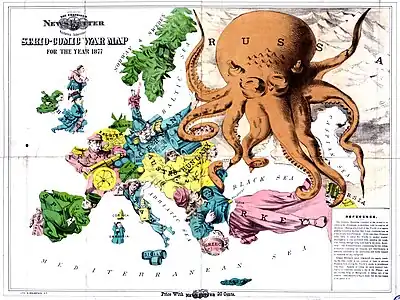 Războiul Crimeii (1853–1856) a fost un conflict dintre Imperiul Rus pe de-o parte și o alianță a Regatului Unit, Franța, Sardinia și Imperiul Otoman pe de altă parte. Rusia a fost înfrântă în cele din urmă.[63][64][65]