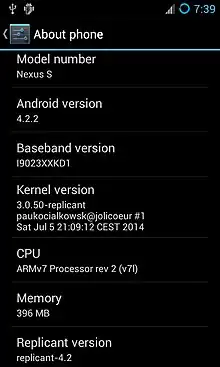 Un exemplu de informații de telefon în Replicant, inclusiv o scurtă descriere hardware