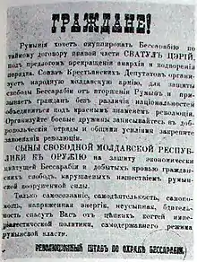 Tot în acea perioadă, RSFSR și URSS au trimis o notă guvernului român, sub formă de ultimatum, cerând retragerea trupelor românești din Basarabia. Românii nu au răspuns, astfel încât pe 5 mai 1919 pe teritoriul Ucrainei a fost stabilit un guvern provizoriu al RSS Basarabia. Unirea Basarabiei cu România nu a fost recunoscută de către sovietici și proclamarea RSS Basarabia a fost o măsură politică care viza pregătirea unei invazii viitoare a Basarabiei de către armata sovietică.