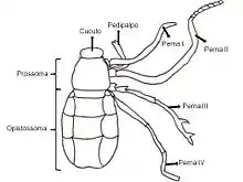 Pedipalpii sunt alcătuiți din următoarele segmente: coxă, trohanterul, femurul, patelă, tars și gheare. Articolul terminal - tarsului (fix) și ghearele (mobile) formează o chelă (clește). Pedipalpii sunt folosiți la manipularea hranei, dar și ca organe senzitive datorită abundenții a perișorilor senzitivi [6].
