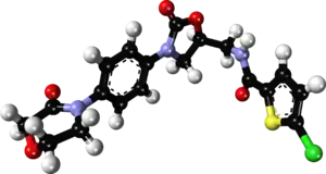 Rivaroxabanul (cu denumirea comercială Xarelto) este un medicament anticoagulant acționând ca un inhibitor direct al factorului Xa al coagulării sanguine.[10][11] Calea de administrare disponibilă este cea orală.[10][11] Prezintă mai puține interacțiuni medicamentoase decât warfarina.[12]