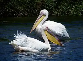 Pelicanii viețuiesc alături de alte specii de păsări migratoare rare, printre care: lopătar (Platalea leucorodia), egretă mare (Egretta alba), egretă mică (Egretta garzetta), stârc de noapte (Nycticorax nycticorax), cormoran mic (Phalacrocorax pygmeus) sau cormoran mare (Phalacrocorax carbo).