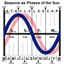 În multe tradiții ale cosmologiei păgâne moderne, toate lucrurile sunt considerate ciclice, cu timpul asemeni unui ciclu perpetuu de creștere și retragere legat de moartea și renașterea anuală a Soarelui . Acest ciclu este de asemenea privit ca un microcosmos și un macrocosmos al altor cicluri de viață într-o serie incomensurabilă de cicluri ce compun Universul. Zilele care se încadrează pe reperele ciclului anual marchează în mod tradițional începuturile și mijlocul celor patru anotimpuri. Sunt priviți cu semnificație și găzduiesc festivaluri majore în comun. Aceste opt festivaluri sunt cele mai frecvente perioade pentru sărbătorile comunității. [1] [12] [13]
