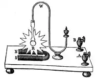 Un disc de cupru care se poate roti în plan vertical, are o margine cufundată într-o baie de mercur. Aceasta este una din bornele motorului, cealaltă fiind chiar axul discului. Un magnet în formă de U este plasat astfel încât cele două fețe ale discului sunt orientate către polii acestuia. Contactând cele două borne la o sursă de curent continuu, se va observa rotirea discului.