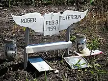 Un serviciu memorial pentru Roger Peterson a avut loc la Redeemer Lutheran Church, Ventura, Iowa, la 5 februarie 1959. Înmormântarea a avut loc a doua zi, la Biserica Luterană Sf. Pavel, în orașul său natal din Alta, Iowa. Peterson a fost îngropat în Cimitirul Buena Vista Memorial în apropiere de Storm Lake. Mormântul lui Peterson este situat la coordonatele N 42 39.189 W 095 13.996. Părinții lui Peterson au primit mai târziu scrisori de condoleanțe de la familiile lui Holly și Valens. Avea numai 21 de ani, în momentul morții.