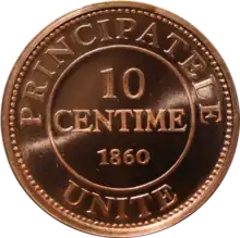 Reversul conține, în centru, inscripția "10 CENTIME" și milesimul 1860, totul într-un cerc, la exterior, inscripția "PRINCIPATELE UNITE", lângă chenar, un cerc perlat.[8]
