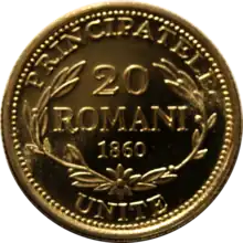 Reversul prezintă, în centru, inscripția "20 ROMANI" și milesimul 1860, totul într-o ghirlandă de laur, la exterior, inscripția "PRINCIPATELE UNITE", iar lângă chenar, un cerc perlat.