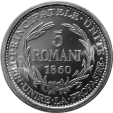 Reversul conține, în centru, inscripția "5 ROMANI" și milesimul 1860, totul într-o ghirlandă de laur, la exterior, sus și jos, inscripțiile în arc de cerc "PRINCIPATELE UNITE" și "PRIN UNIRE LA PROPASIRE", iar lângă chenar, un cerc perlat.