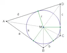 Într-un Patrulater circumscriptibil (cu cerc înscris) cele patru segmente dintre centrul cercului și punctele în care el este tangent la patrulater (r, cu verde în figura alăturată) împart patrulaterul în patru romboizi dreptunghici.
