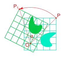 - Unghiurile lui Euler. Orice rotație în jurul originii poate fi reprezentată ca o compunere a trei rotații, definite ca deplasarea obținută prin schimbarea unuia dintre unghiurile lui Euler menținând constante celelalte două. Acestea constituie un sistem de axe de rotație mixte, deoarece unghiurile sunt măsurate în raport cu un amestec de sisteme de coordonate diferite în loc să fie măsurate față de un singur sistem, fie pur extern, fie pur intrinsec. Mai exact, primul unghi deplasează linia nodurilor în jurul axei externe z, al doilea rotește în jurul liniei nodurilor, iar al treilea este o rotație în jurul unei axe fixate de corpul care se mișcă. Unghiurile Euler sunt de obicei notate α, β și γ, sau φ, θ și ψ. Această prezentare este convenabilă numai pentru rotații în jurul unui punct fix.
