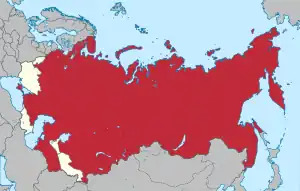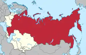 După război, Europa Centrală și de Est, inclusiv Germania de Est și o parte din Austria au fost ocupate de Armata Roșie conform înțelegerii de la Conferința de la Potsdam. URSS a suprimat eforturile de clădire a unor state democratice moderne în teritoriile ocupate, forțând instaurarea de regimuri totalitare comuniste, guverne pe care și le-a aservit constituind Blocul Răsăritean, și cărora nu le-a permis nicio reformă liberală, invadând chiar Cehoslovacia când aceasta a încercat așa ceva în 1968. Devenind a doua putere nucleară a lumii, URSS a impus acelor state comasarea în Pactul de la Varșovia, o alianță care a intrat într-o luptă pentru dominare globală cunoscută sub numele de Războiul Rece, cu Statele Unite și NATO. Uniunea Sovietică a sprijinit mișcări revoluționare comuniste în întreaga lume, inclusiv în nou formata Republică Populară Chineză, în Republica Populară Democrată Coreea și, mai târziu, în Republica Cuba. Importante resurse sovietice au fost alocate pentru susținerea(d) regimurilor comuniste din alte țări.[85]