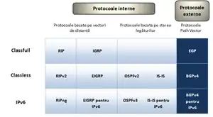 - Classless (Utilizarea VLSM) și Classfull – protocoalele de rutare de tip classless includ masca de rețea în mesajele de actualizare. Această caracteristică suportă opțiunea Variable Length Subnet Masking (VLSM) și o sumarizare mai optimală a rutelor. Protocoalele de rutare classfull nu includ masca de subrețea și nu suportă VLSM.