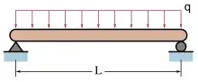 La o bară rezemată la capete încărcată cu o sarcină distribuită uniformă săgeata maximă apare la mijlocul barei și poate fi calculată cu relația:[4][8]