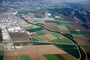 Râul Pajaro separă comitatele Santa Cruz (în stânga imaginii) de comitatul Monterey (la dreapta), statul