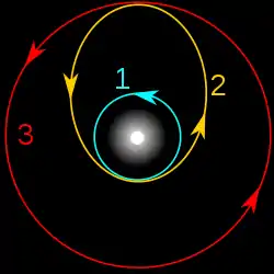 Agenția Spațială Americană a comandat firmei Hughes Aircraft Company realizarea primului satelit geostaționar SYNCOM. Inginerii de la Hughes Aircraft au pus la punct tehnica lansării pe orbită geostaționară care permite cel mai bine utilizarea capacităților lansatorului și care va fi, în mod sistematic, aplicat în continuare: la 26 iulie 1963 satelitul Syncom a fost plasat pe orbită de o rachetă Thor-Delta pe o orbită joasă (1, în albastru deschis, pe schema de alături) apoi a fost aprinsă ultima treaptă a rachetei pentru a plasa satelitul pe o orbită eliptică al cărei apogeu se situa la 36.000 km (Orbită de transfer geostaționară (2, în galben)). În sfârșit a fost pornit un motor de apogeu, cu propergol solid, solidar cu satelitul, care a circularizat orbita (3, în roșu). Acest prim satelit geostaționar, cu o masă limitată la 39 kg nu era decât geosincron, adică longitudinea sa fiind fixă, latitudinea sa oscila între 39°N și 39S. Și-a îndeplinit totuși perfect rolul. Un al doilea satelit Syncom, lansat în iulie 1964, a fost plasat pe o orbită geostaționară, fix deasupra ecuatorului, și a retransmis Jocurile Olimpice de la Tokyo din același an.[6] Pe de altă parte, proiectul satelitului militar de telecomunicații, ADVENT, a fost abandonat un an mai târziu, victimă a întârzierilor din cauza complexității satelitului planificat și a costurilor suplimentare ale proiectului. Proiectul conceput de militari era prea ambițios pentru epoca respectivă. Este vorba despre un satelit stabilizat pe 3 axe, în timp ce prototipurile NASA și AT&T sunt rotite în jurul unei axe. Acestea din urmă sunt mai simple, dar nu acceptă desfășurarea unor antene mari sau panouri solare (celulele solare se află pe corpul satelitului care are o formă cilindrică) ceea ce le limitează capacitatea. Datorită în special acestei alegeri, satelitul studiat de armată era mult mai greu, ceea ce necesita un lansator cu o treaptă superioară puternică. Or, singura etapă superioară potrivită, Centaur era în dezvoltare. Proiectul a acumulat întârzieri și nu va fi finalizat până în 1966. Primul satelit stabilizat de telecomunicații comerciale cu 3 axe nu va fi lansat până în 1975 (Satcom), dar această arhitectură tehnică va deveni larg răspândită ulterior.[1]