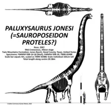 Numele Paluxysaurus s-a bazat pe specimenul FWMSH 93B-10-18, un craniu parțial care include maxilarul stâng, osul nazal și dinți. Alte oase din carieră au inclus un gât parțial de șapte vertebre, treisprezece vertebre din spate și 30 de la coadă și exemple din toate oasele membrelor și brâului, cu excepția unor oase ale mâinii și ale piciorului. S-a diferențiat de toate celelalte sauropode prin detalii vertebrale și are diferite diferențe morfologice în alte oase în comparație cu alte sauropode din Cretacicul timpuriu al Americii de Nord. Genul era limitat la rămășițele din stratul de oseminte; de exemplu, scheletul parțial din comitatul Wise cunoscut sub numele de Pleurocoelus sp. (SMU 61732) nu se referă la Paluxysaurus; în schimb acel exemplar este holotipul Astrophocaudia slaughteri D'Emic 2012, un alt sauropod somfospondylan. Există diferențe în resturile de P. sp. și Paluxysaurus, dar nu pot fi diferențiate cu încredere.[8] În 2012, reanalizarea acestor exemplare în lumina rămășițelor suplimentare de Sauroposeidon i-a determinat pe paleontologii D'Emic și Foreman la concluzia că Paluxysaurus era același animal cu Sauroposeidon și, prin urmare, un sinonim junior al lui S. proteles.[9]