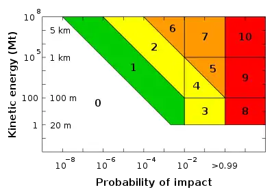 | 6 | O întâlnire apropiată cu un obiect mare, care prezintă o amenințare serioasă, dar încă incertă, a unei catastrofe globale. O atenție critică din partea astronomilor este necesară pentru a determina dacă există sau nu posibilitatea unui impact. În cazul în care coliziunea este prevăzută la mai puțin de trei decenii, trebuie avute în vedere măsuri guvernamentale de urgență. |