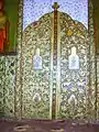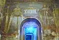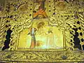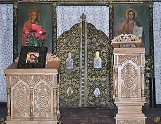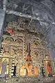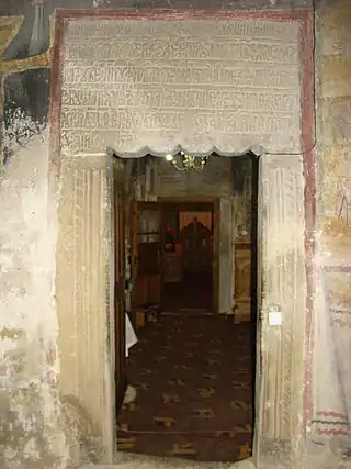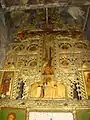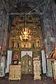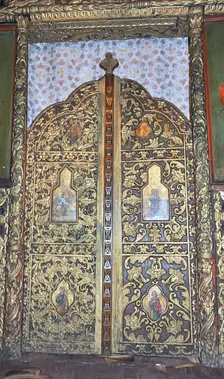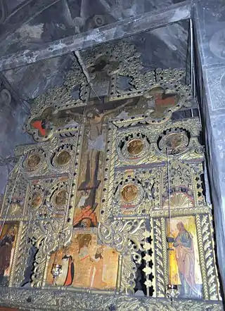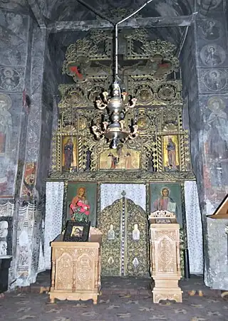 Catapeteasma - înaltă până la boltă - este de lemn, cu o sculptură ornamentală, poleită cu foiță de aur. Deasupra crucii Mântuitorului stă scris motivul osândirii Sale, în limbile ebraică, greacă și latină “Iisus Nazarineanul, regele Iudeilor”. Mai jos, sub picioarele lui Hristos, stă în genunchi în partea dreaptă Matei Vodă cu coroana pe cap, în mantie domnească, cu mâinile rugătoare, având inscripția: “Io Matei Basarab Voevod”. Iar în cea stângă, se afla tot în aceiași porțiune Mitropolitul Ștefan, cu mitra pe cap și cu omoforul pe umeri, cu inscripția tot în slavonește: Chir Ștefan mitropolit și arhiepiscop a toată Țara”[1]. Naosul și pronaosul sunt cam la fel de spațioase, despărțite de un zid înalt până la boltă, cu o deschidere cât o ușă obișnuită.