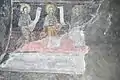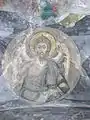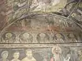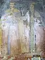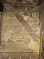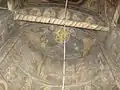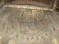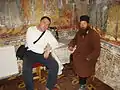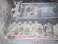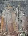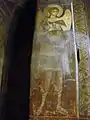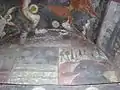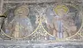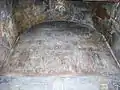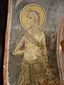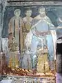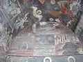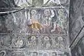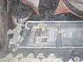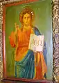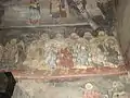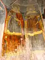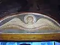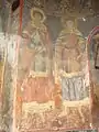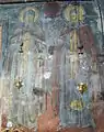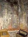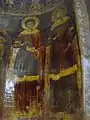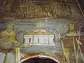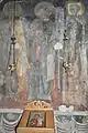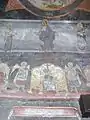 Potrivit unui vechi procedeu de influență bizantină, biserica a fost sfințită fără a fi pictată, ci numai împodobită cu icoane și tâmplă sau catapeteasmă. Sub Crucea de la Răstignire, pictorul a scos în relief portretul lui Matei Basarab voievod, precum și a lui Ștefan, mitropolitul Țării Românești. Această pictură s-a executat între anii 1648-1654, timp de 6 ani, și a rămas până în zilele noastre o veritabilă capodoperă a picturii și sculpturii românești. Pictura bisericii în interior a fost executată de către Grigorie zugravul și fiul său Ioan, în anii 1756-1757. Pisania picturală se află scrisă în penel deasupra intrării în naos: „Această sfântă biserică a fost zidită din temelie de către Dumitru Filișanul, mare pitariu, în zilele marelui voievod Matei Basarab, fiind egumen la această mănăstire Vartolomeu, fiul popei Ioan Hotinescu din Drăgoiești. Acesta luând blagoslovenie de la Prea Sfinția Sa Părintele Episcop Kir Grigorie, au procurat cele necesare și apoi au pictat-o după cum se poate observa și astăzi.”