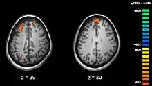 Imaginile de rezonanță magnetică funcțională (fMRI) și alte tehnologii de a obține imagini ale creierului permit studierea diferențelor de activitate cerebrală la persoanele diagnosticate. Imaginea prezintă două nivele ale creierului, cu arii (colorate în roșu) care sunt mai active în persoanele de control (sănătoase, imaginea din stânga) decât la suferinzii de schizofrenie (imaginea din dreapta). Imaginea provine dintr-un studiu cu fMRI a memoriei de lucru.[67]