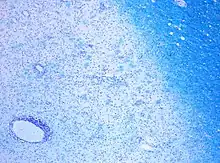 ![]() Demielinizare datorată SM. Țesutul colorat CD68 arată câteva macrofage în zona leziunii, la scara originală de 1:100 | |
