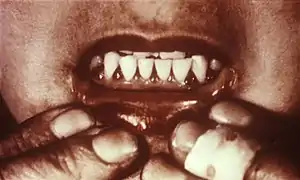 ![]() Scorbutul poate cauza inflamație și hemoragie gingivală, o afecțiune numită gingii scorbutice | |