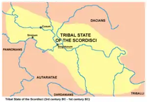 - The central Balkan tribes in pre-Roman times: Triballi, Autariatae, Dardanians, Scordisci and Moesians by Fanula Papazoglu,ISBN 90-256-0793-4,1978,page 286,"As to where the battle between the Scordisci and Cosconius' troops took place,nothing definite can be said. The Scordisci had perhaps entered Thrace"