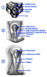 Hormonii sexuali masculini sunt secretați de testicule mai târziu în viața embrionară pentru a provoca dezvoltarea organelor sexuale secundare. Scrotul este omolog, din punct de vedere al dezvoltării, u labiile mari, rafeul scrotal - cu marginile externe ale labiilor mici. Organele și țesuturile reproductive se dezvoltă la femeie, iar la bărbați încep în a cincea săptămână după fertilizare. Creasta gonadală crește în spatele membranei peritoneale. În cea de-a șasea săptămână, se formează țesuturi asemănătoare coardelor numite cordoane sexuale primare în creasta gonadală mărită. Extern, peste membrana cloacală apare o umflătură numită tubercul genital.