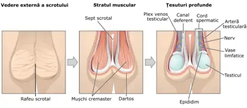 Tunica dartos– se află imediat sub piele se găsește, este o lamă fină alcătuită din celule musculare netede și fibre conjunctive elastice, mai dezvoltată în regiunea anterolaterale și mai subțire în regiunea posterioară. Tunica dartos aderă intim de pielea scrotală, prelungindu-se cu dartosul penian și perineal. Datorită musculaturii, această tunică este responsabilă de încrețirea pielii și ridicarea (sau coborârea) scrotul spre abdomen.