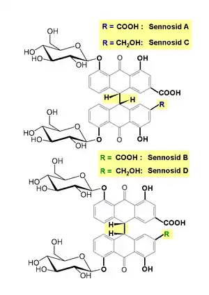 Senozidele sunt extrase din genul de plante Senna, iar din punct de vedere chimic sunt derivați de antracen, și pot fi considerați a fi chiar derivați de antrachinonă.[1]